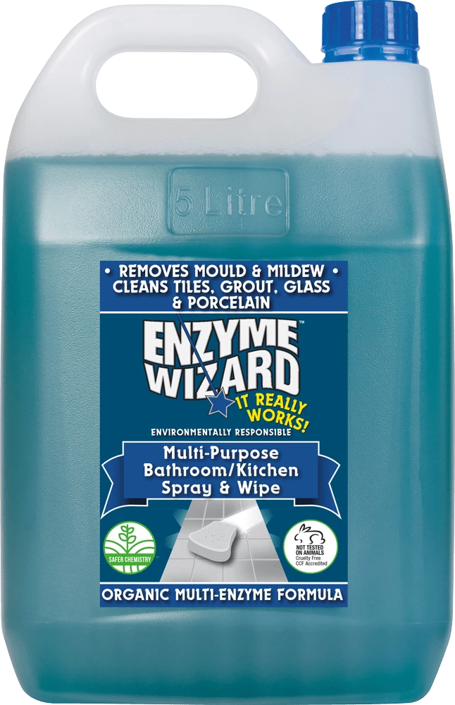 Enzyme Wizard Multi-Purpose Bathroom/Kitchen Spray & Wipe is an industrial-strength, eco-friendly cleaner designed for bathrooms, kitchens, and food-service areas. Powered by a proprietary plant-based multi-enzyme formula, it breaks down mould spores, fungus, mildew, soap scum, oils, and grime—leaving surfaces fresh, streak-free, and hygienically clean.