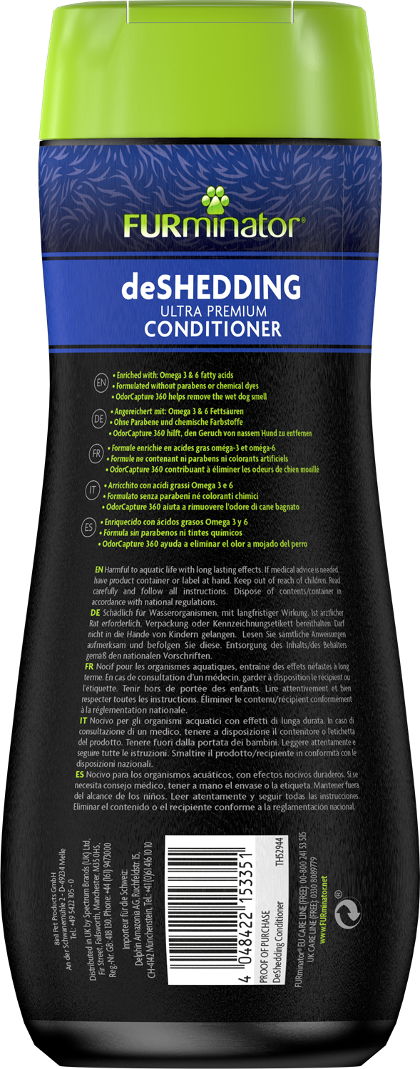 Complete your dog's grooming routine with the FURminator® deShedding Ultra Premium Conditioner, a key part of the FURminator® Ultimate Hair Reduction System™. Specially formulated to reduce excess shedding, this conditioner is enriched with Omega 3 and 6 fatty acids and multiple conditioning agents to deeply nourish the skin and strengthen the coat. When used regularly with the FURminator deShedding Shampoo and tools, it helps maintain a healthy, shiny coat and significantly reduces loose fur around your home.