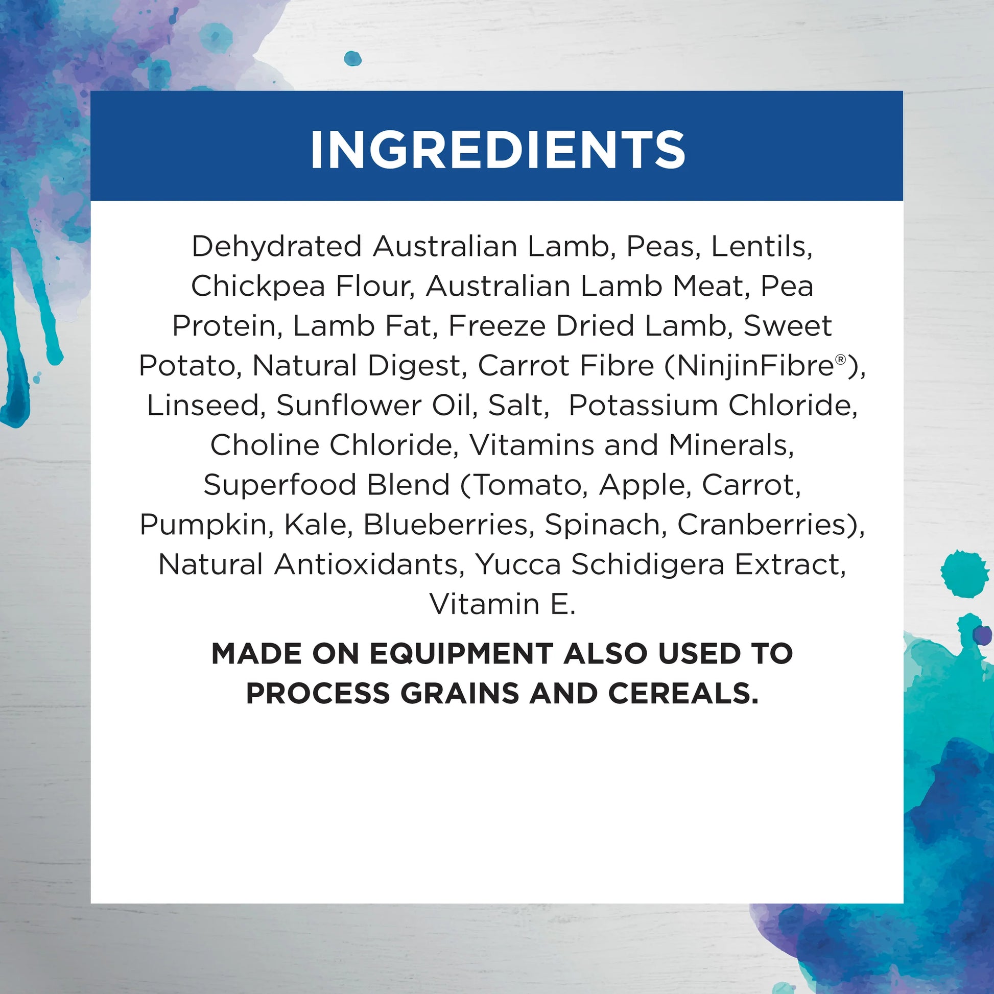 - Combines raw Australian meat with functional ingredients in a cooked kibble format, topped with freeze-dried lamb pieces.