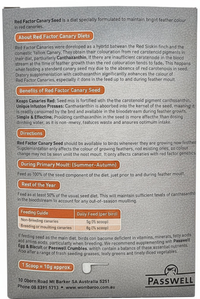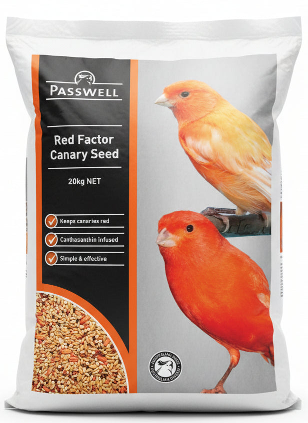 Passwell – Canary Seed – Red Factor is a specialised seed blend infused with red Canthaxanthin to intensify and maintain vibrant red feather colour in Red Factor Canaries. The pigment is absorbed into the kernel and then into the bloodstream, supporting stronger colour expression during moult and all year round colour maintenance.