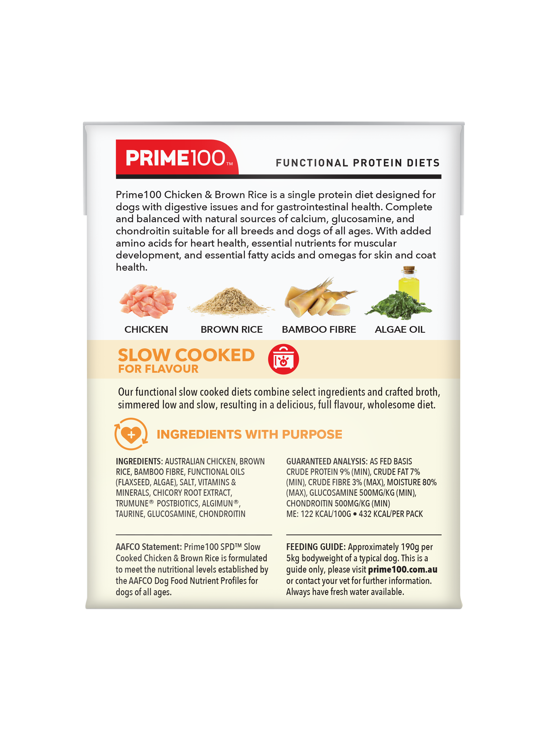 Prime100 SPD Slow Cooked – Chicken & Brown Rice is a nutritious and flavourful option that prioritises your dog's health and the environment. Crafted for optimal digestion and overall well-being, this slow-cooked diet is perfect for dogs of all ages and breeds.