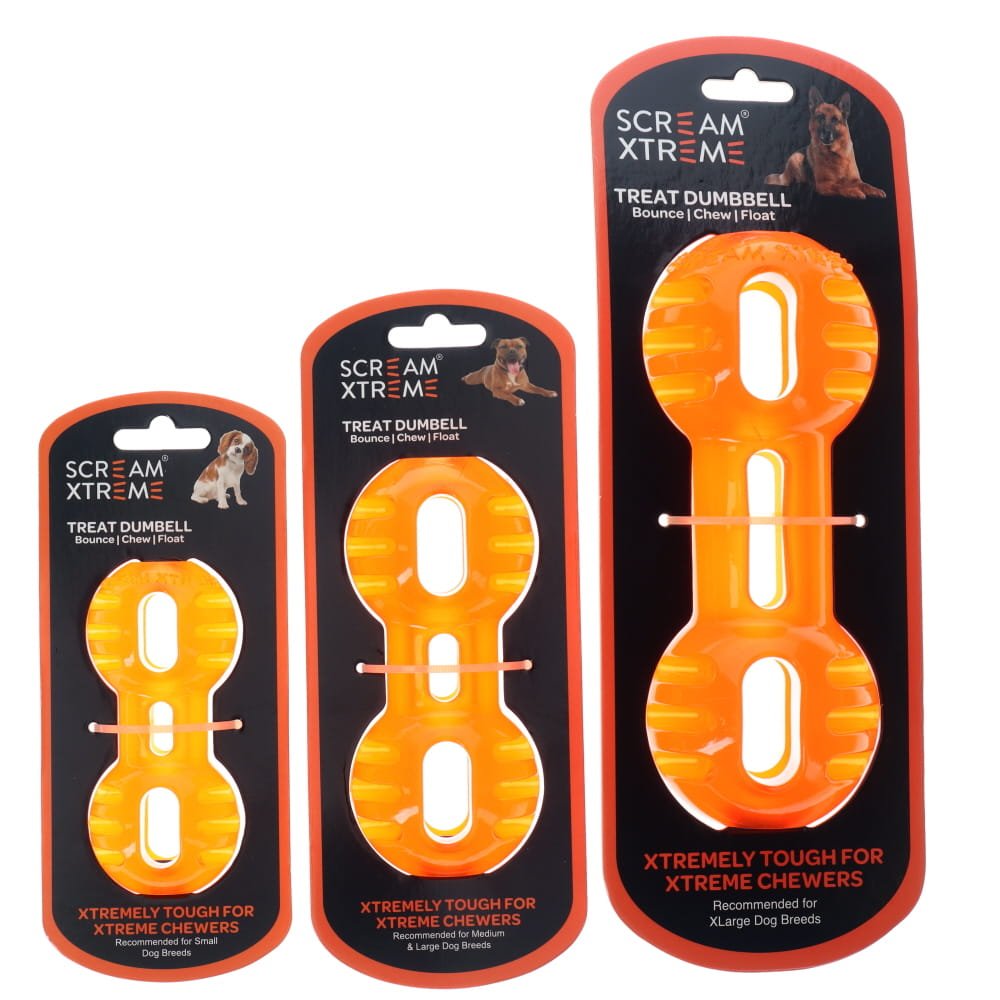 Stop your extreme chewer in their tracks with the Scream Xtreme Treat Dumbbell! Made from durable TPR (Thermoplastic Rubber), this tough toy is perfect for dogs that love to chew, fetch, and play. Designed to hold up against even the strongest jaws, it’s lightweight, tear-resistant, and perfect for all kinds of fun – whether on land or in the water.