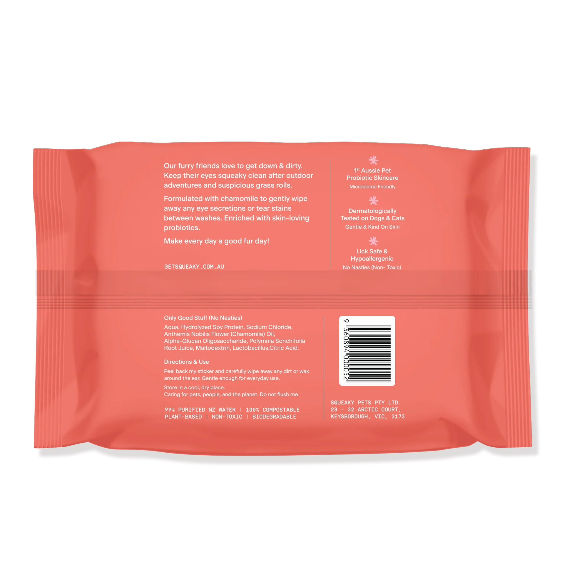Keep your pet’s eyes clean and comfortable with Squeaky Probiotic Pet Eye Wipes – the gentle solution for tear stains and eye build-up between baths. Ideal after outdoor adventures, dusty walks or those mysterious grass rolls.
